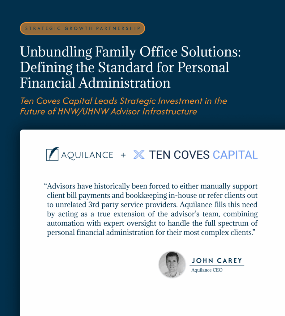 Aquilance’s minority growth investment, led by Ten Coves Capital, reflects the rise of unbundled family office services as a foundational layer of wealth management. By combining automation with expert execution, Aquilance enables advisors and families to manage complex financial lives with greater clarity, control, and scalability.